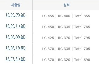 10월달 중순에 나온 9월 25일날 점수가 855점이었습니다.